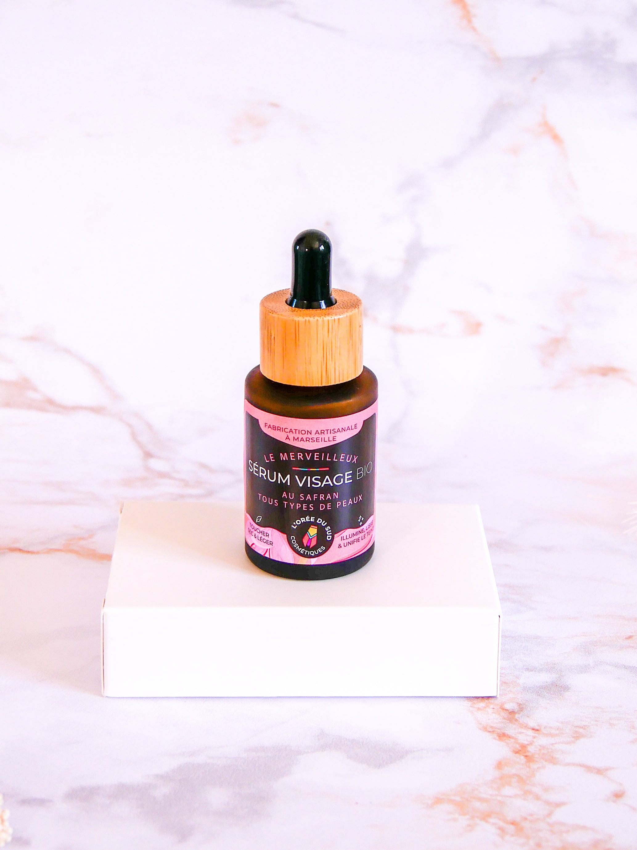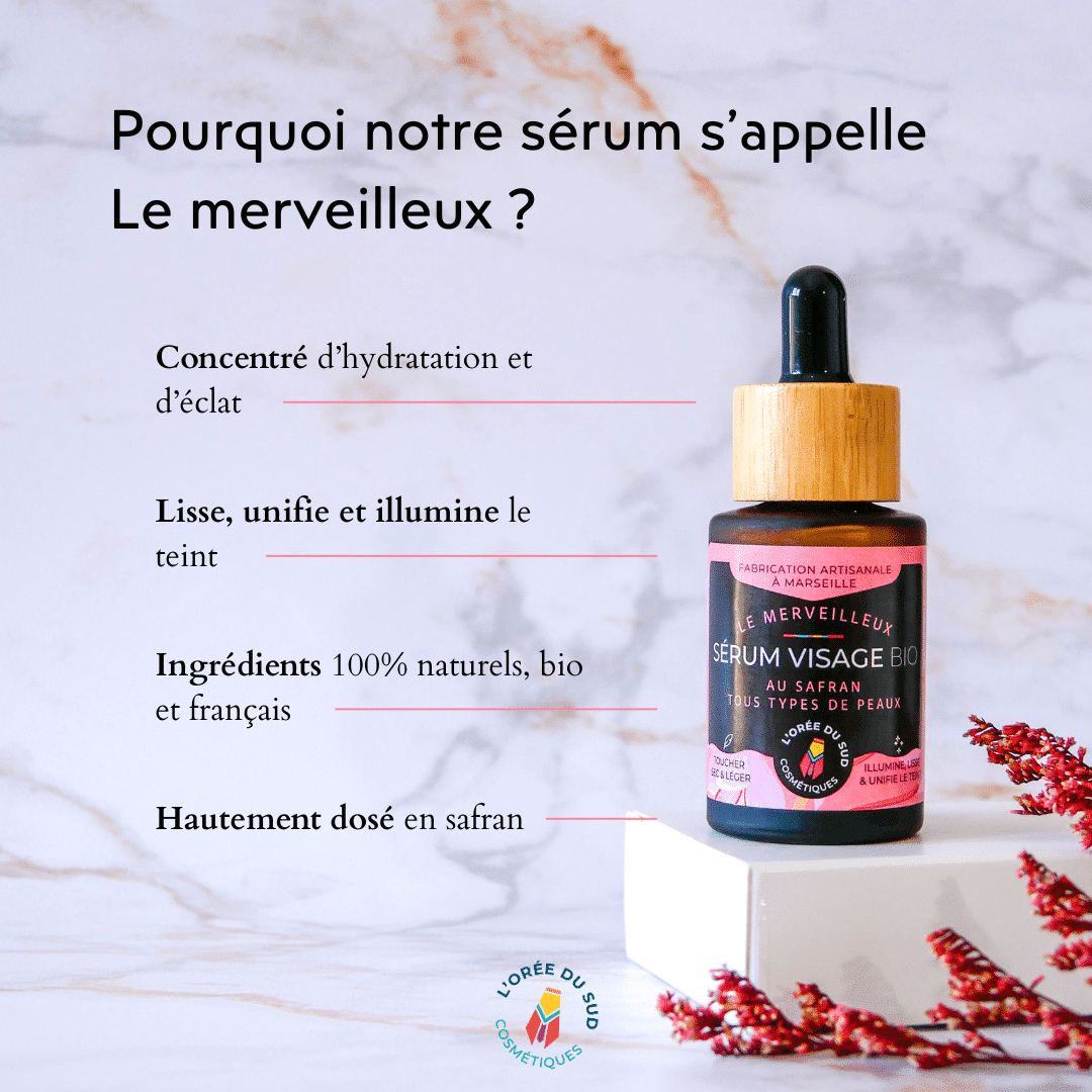 Le sérum visage au safran aussi appelé Le merveilleux porte bien son nom. Offrez à votre peau un concentré d’hydratation et d’éclat avec ce sérum aux cinq huiles précieuses et macérât de plantes, sublimé par les vertus du safran. Sa formule 100 % naturelle, bio et française associe l’amande douce, la noisette, l’abricot et le macérât de lys pour nourrir, apaiser et illuminer la peau sans fini gras ni brillant. Sans parfum, sans perturbateurs endocriniens ni paraben, ce soin d’exception vous donnera la sensation d’une nouvelle peau plus fraîche, plus belle et plus unifiée.